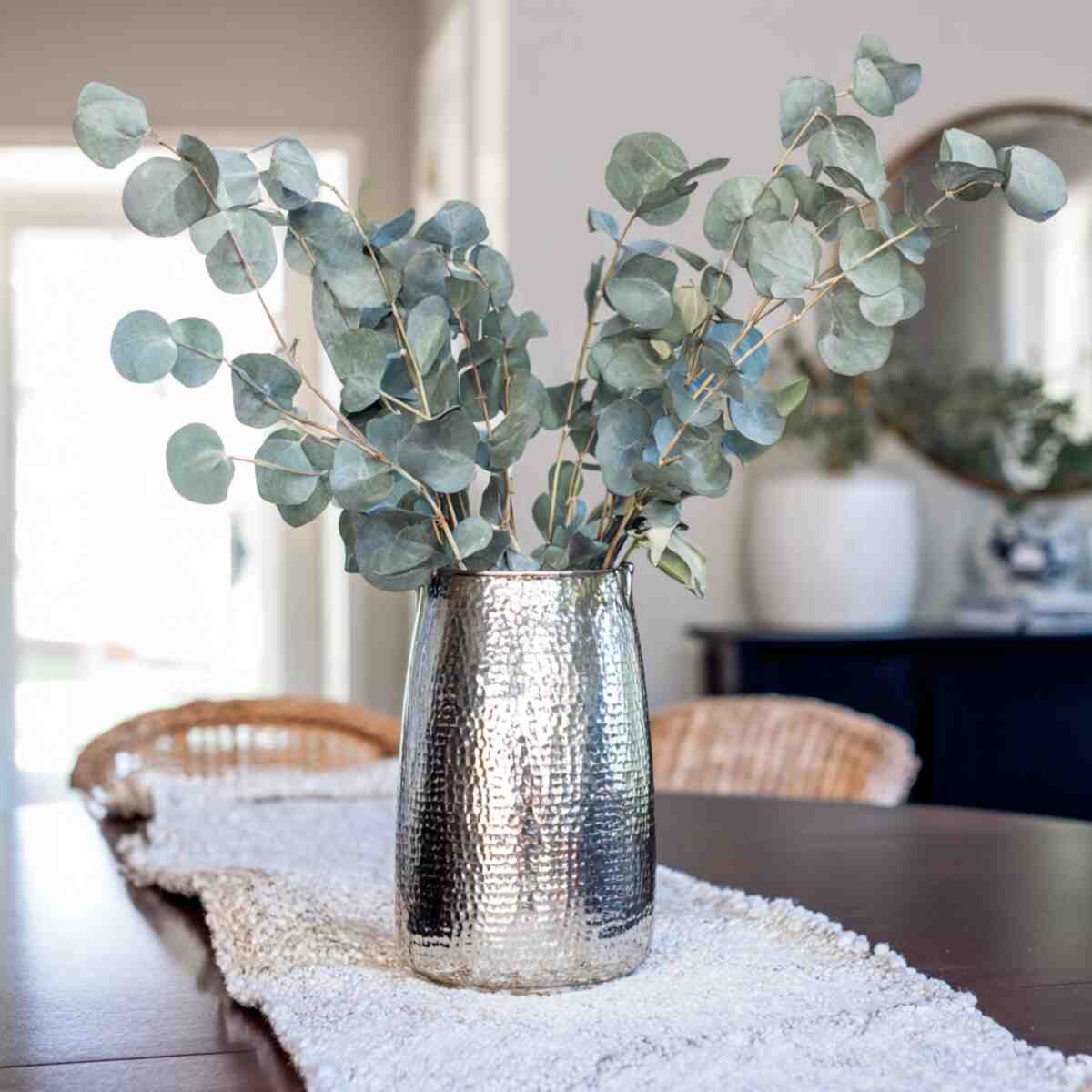 The soft green tones of eucalyptus complement the reflective metal beautifully. This Dining Table Vase Styling Idea blends elegance with simplicity, making it ideal for modern homes.