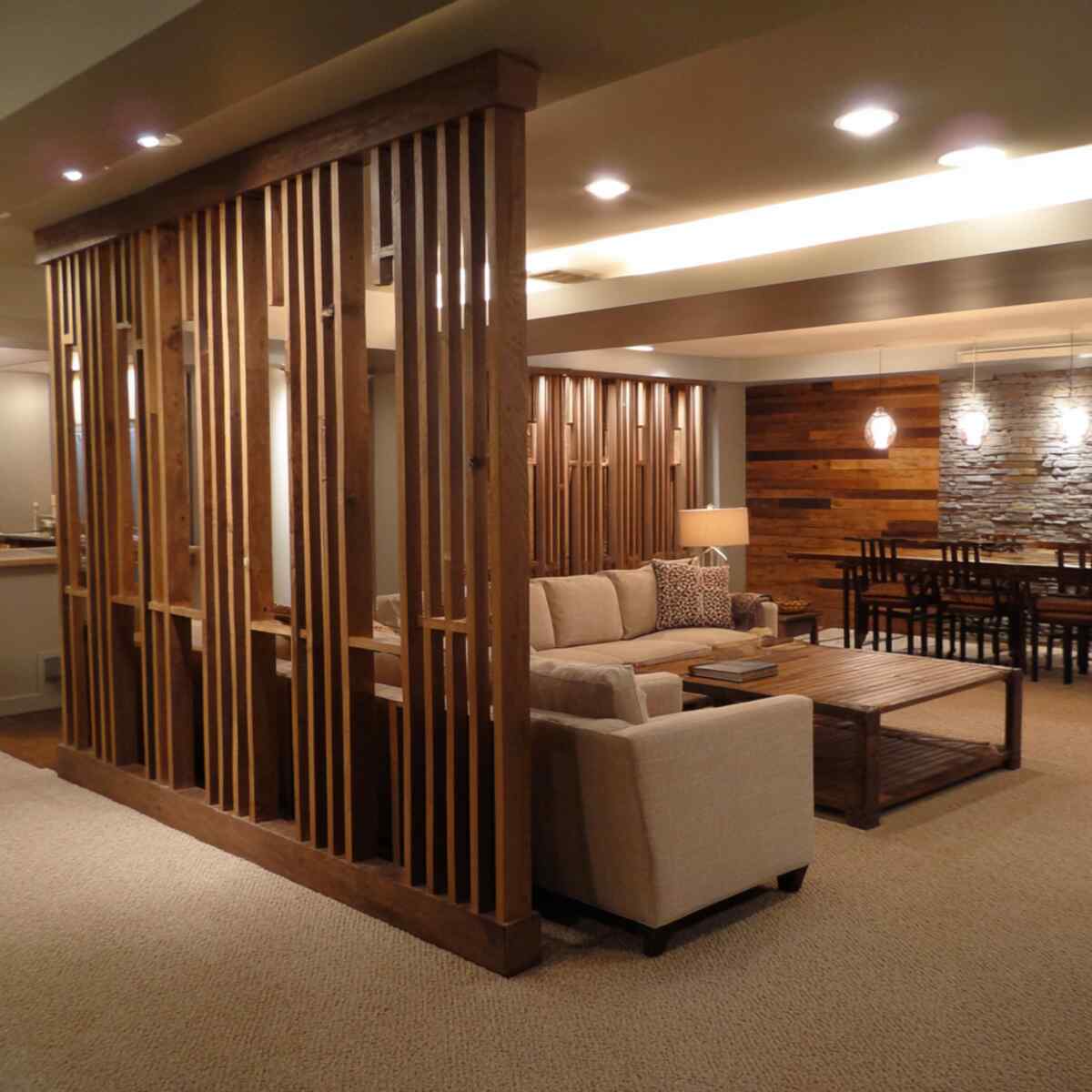 A wood slat divider adds warmth and texture while subtly separating areas, making it one of the most stylish DIY Basement Divider Wall Ideas for modern or cozy basements.