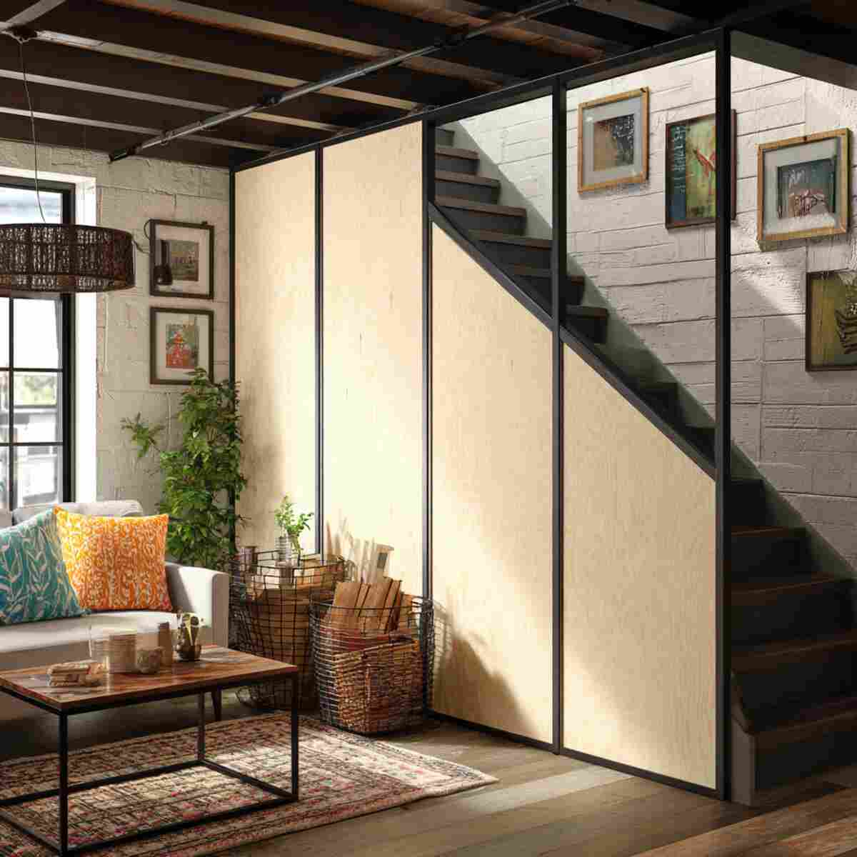 As a DIY Basement Divider Wall Idea, it is important because it gives structure and definition while remaining simpler than full wall construction.