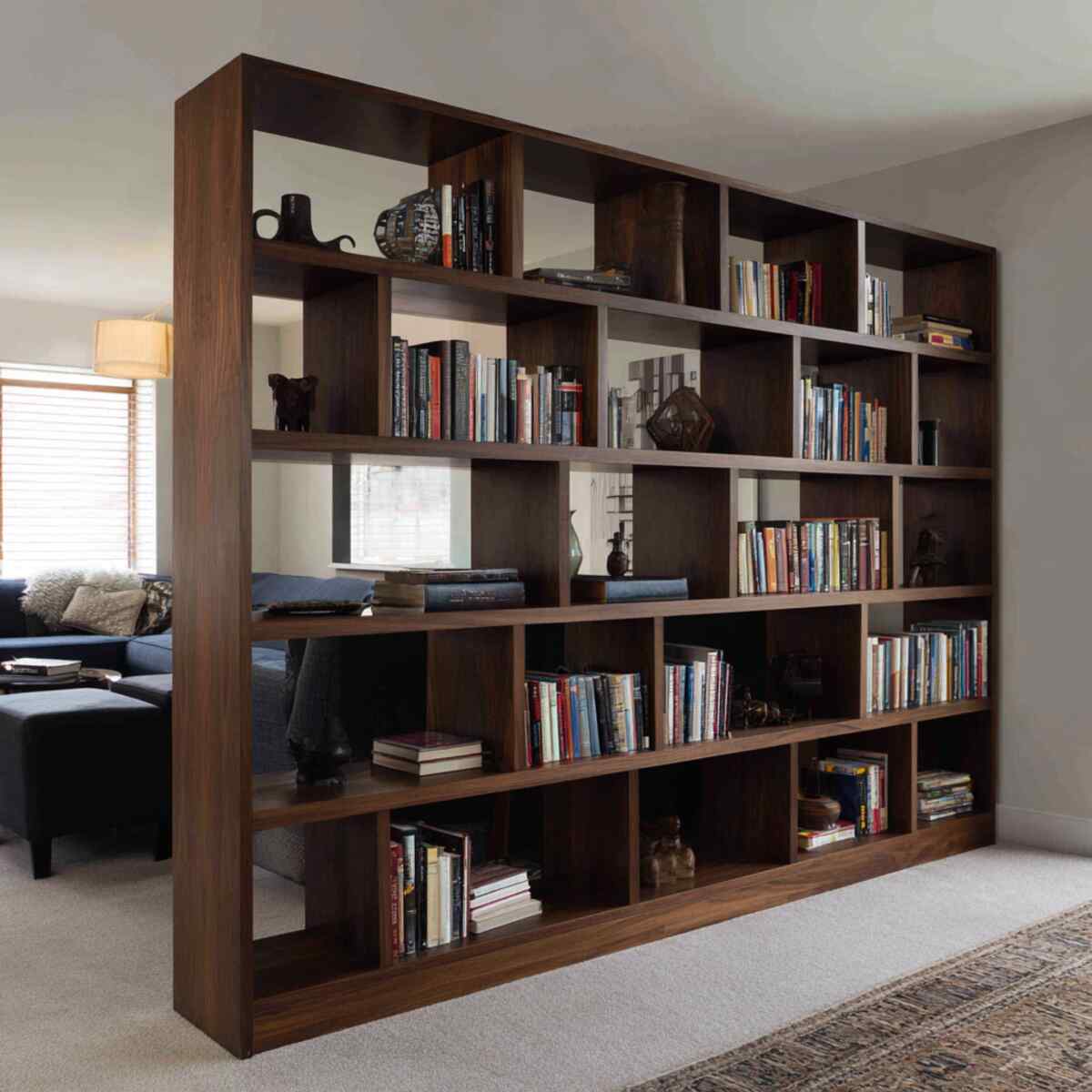 An open bookshelf divider doubles as storage and separation, which makes it one of the most functional DIY Basement Divider Wall Ideas. It helps define zones while keeping the basement open and usable, especially in smaller spaces.
