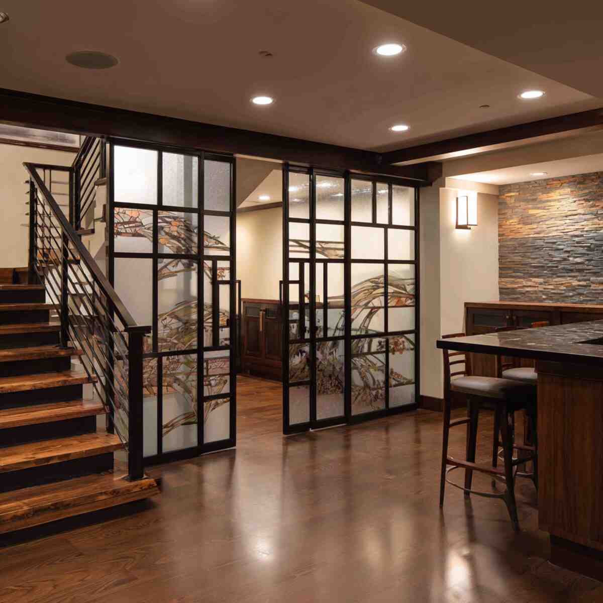 A glass panel divider is one of the brightest DIY Basement Divider Wall Ideas, allowing natural or artificial light to travel across spaces.