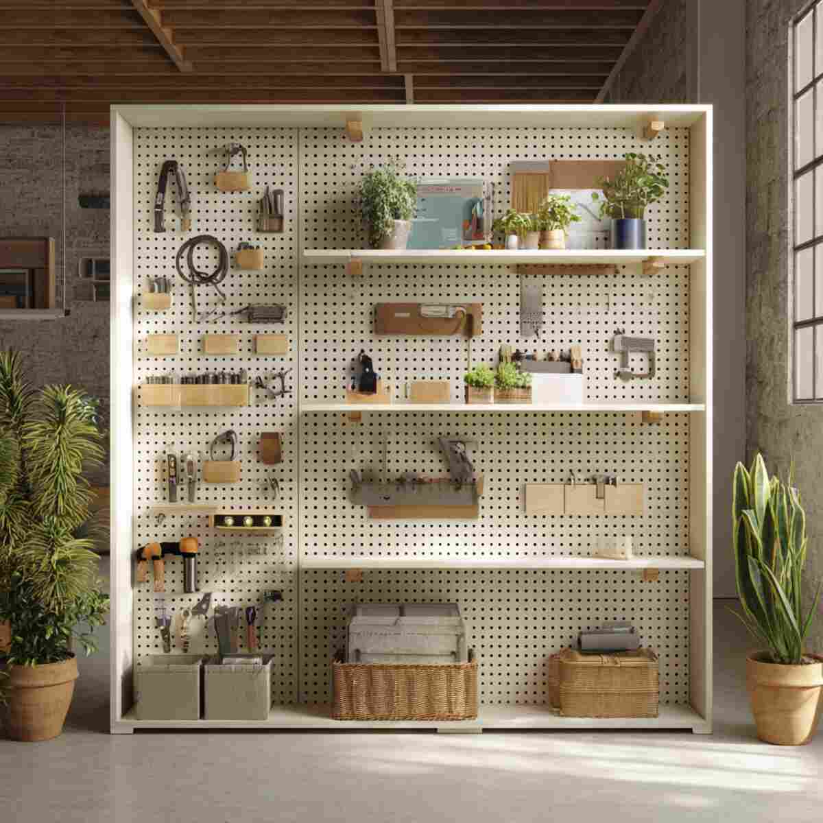 A pegboard divider wall combines organization with separation, making it a highly practical DIY Basement Divider Wall Idea.