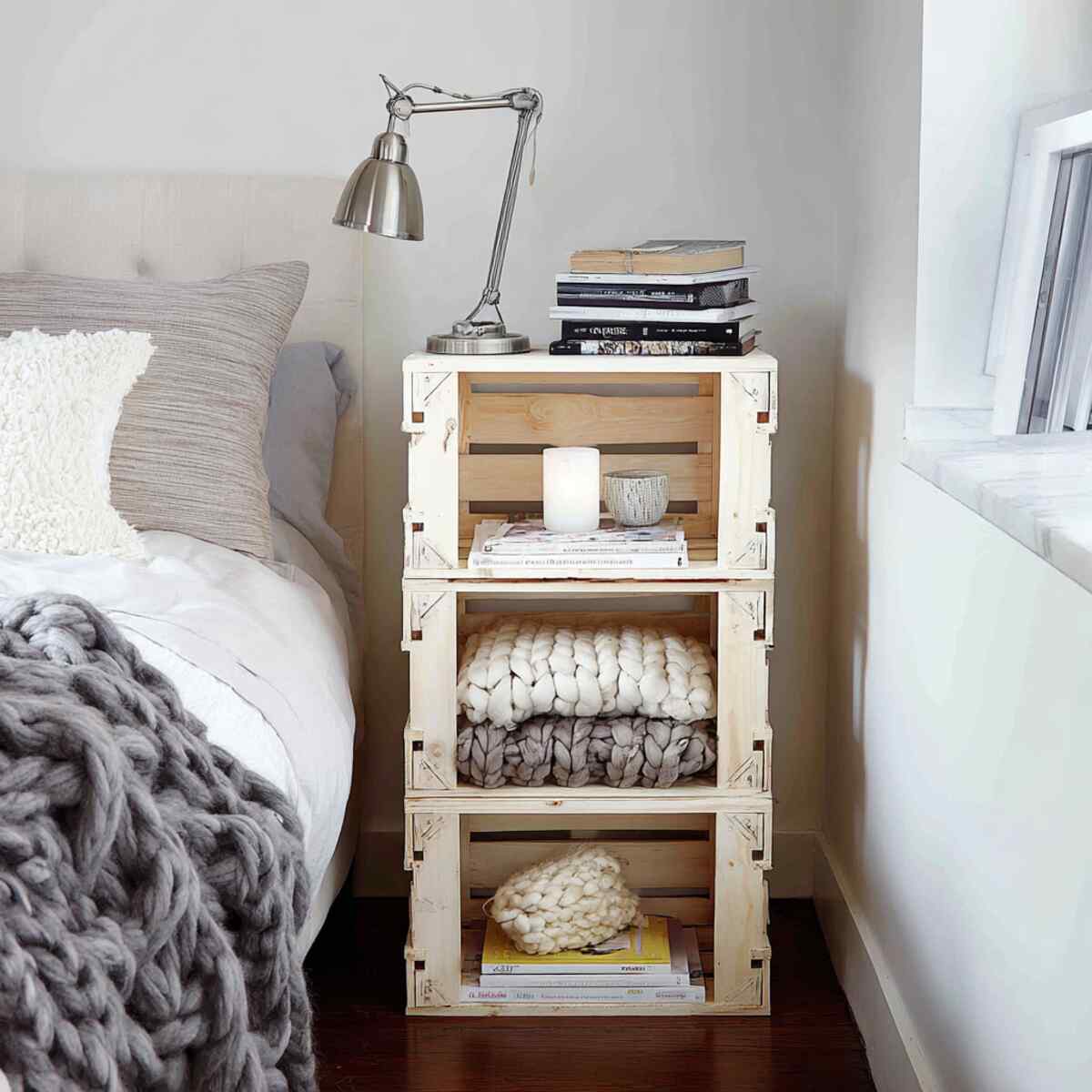 Using multi-compartment DIY storage crates as a nightstand is an excellent way to combine style and functionality.