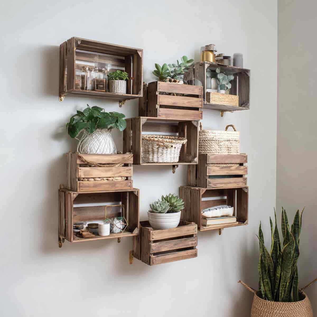 Wall-mounted crates are a fantastic way to add vertical storage without taking up floor space.