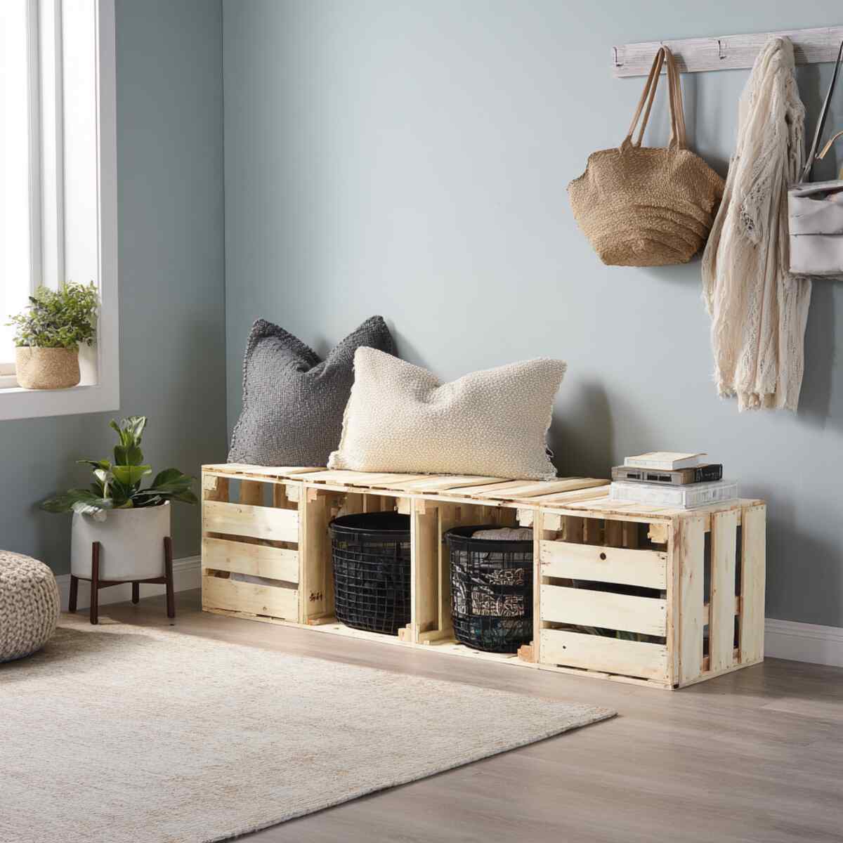 A crate storage bench is a two-in-one piece that offers both seating and storage. By stacking crates and adding a cushion on top, you create a functional bench that can be placed in the entryway, living room, or bedroom.