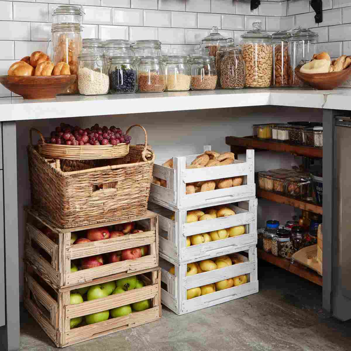 In the kitchen, stackable crates can be used to organize pantry items such as canned goods, dry food, or spices.