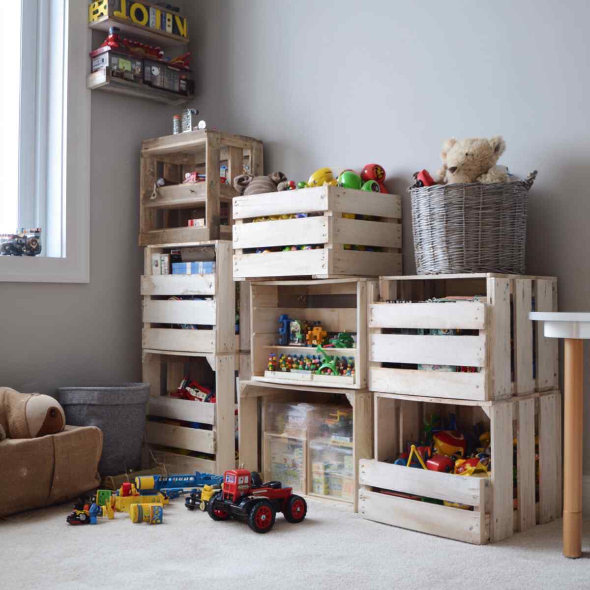 Transform the playroom into an organized space with toy storage crates. Stacking crates in a multi-compartment configuration helps separate toys by type or size, making it easier for kids to put things away.