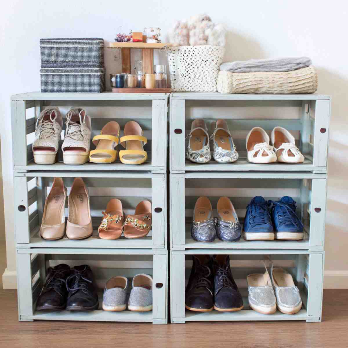A stackable crate shoe organizer is a perfect DIY solution for keeping shoes neatly stored in a closet.