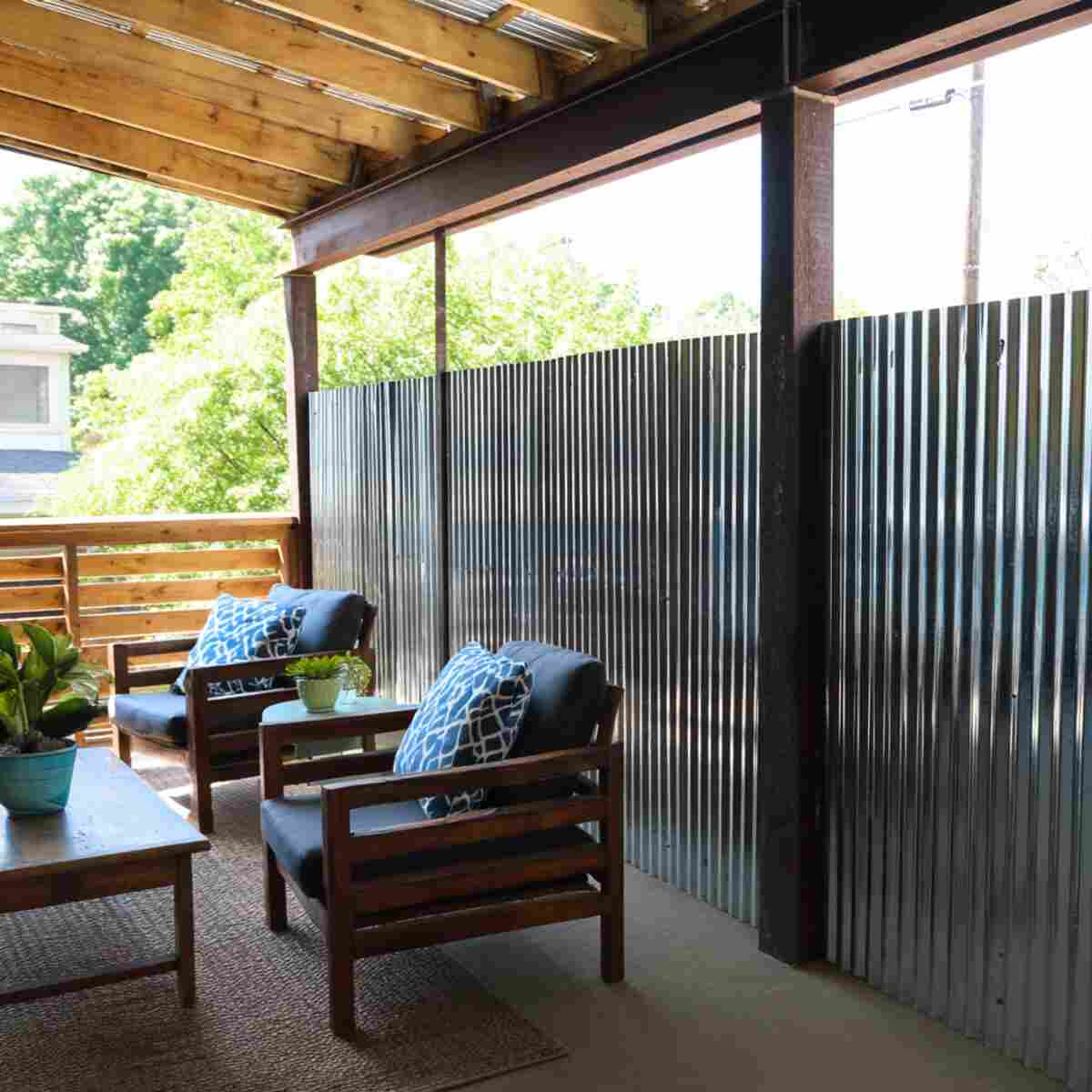 Corrugated metal adds an industrial touch to DIY Porch Privacy Screen Ideas. It is durable, weather-resistant, and effective at blocking direct views.