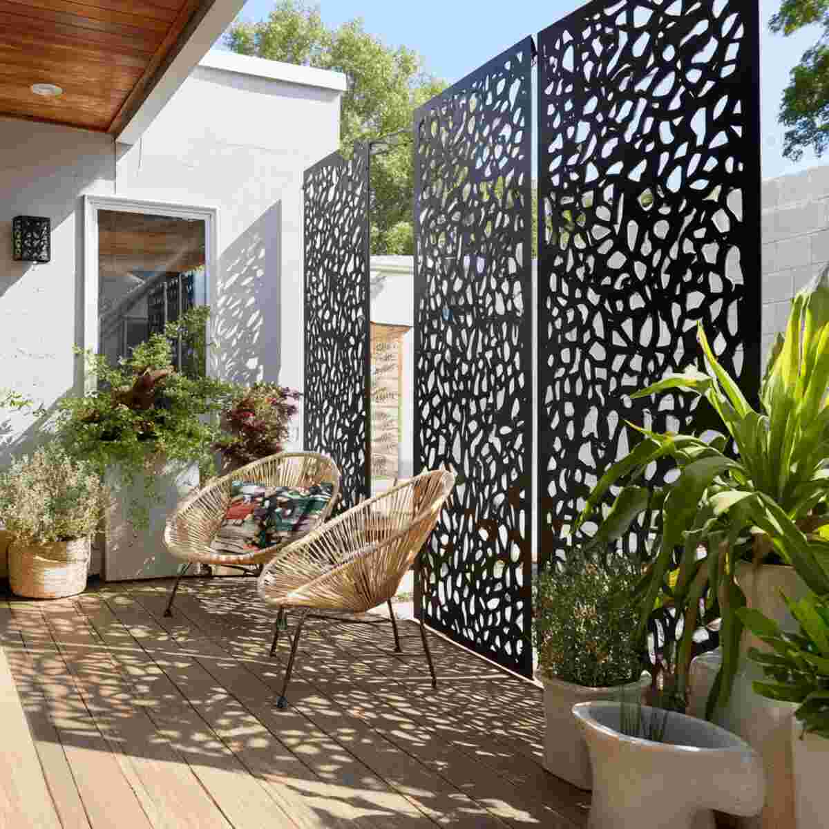 Decorative metal cut-out panels are stylish DIY Porch Privacy Screen Ideas that add pattern and interest.
