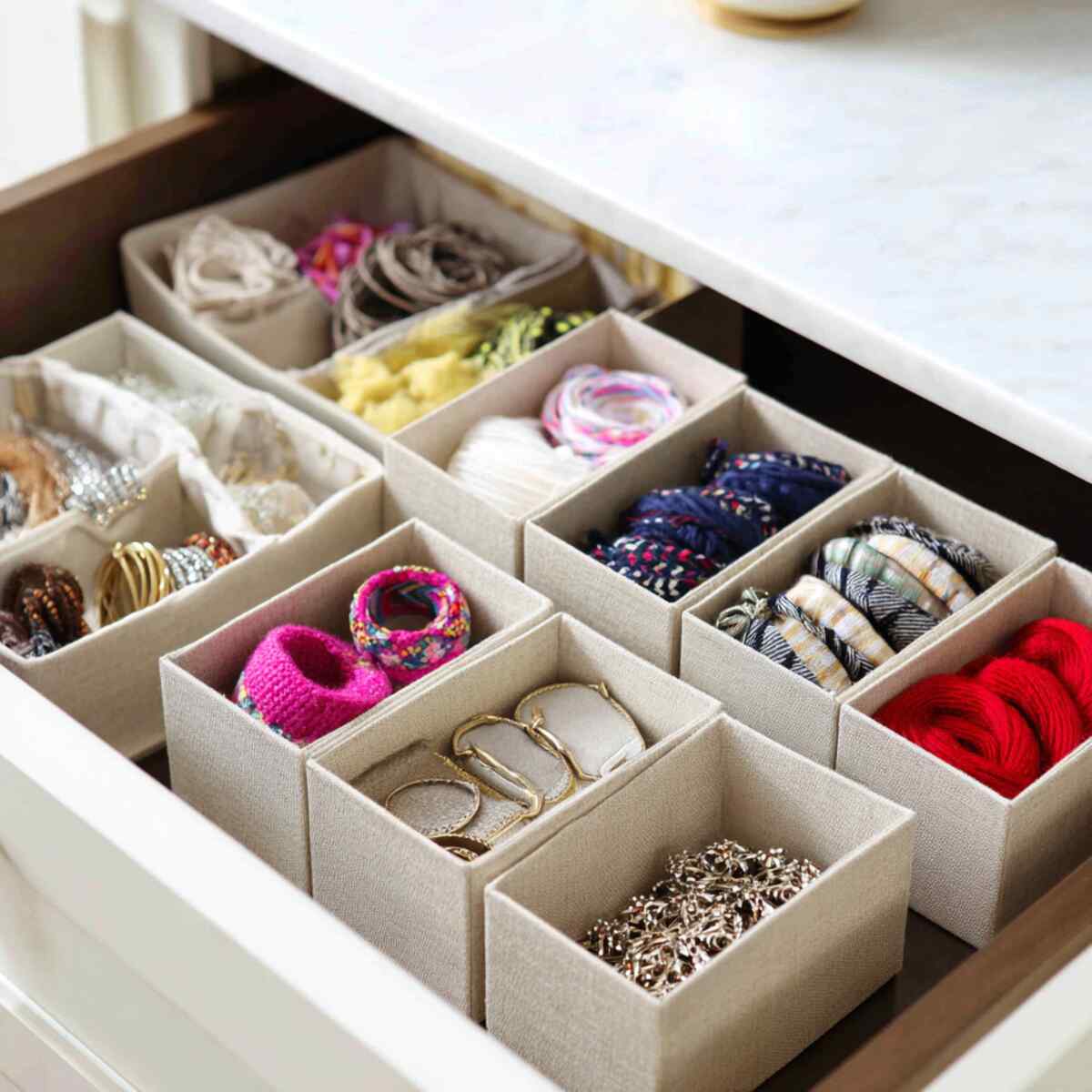 Fabric-lined cardboard boxes add a soft, elegant touch to your vanity drawer while keeping items neatly separated.