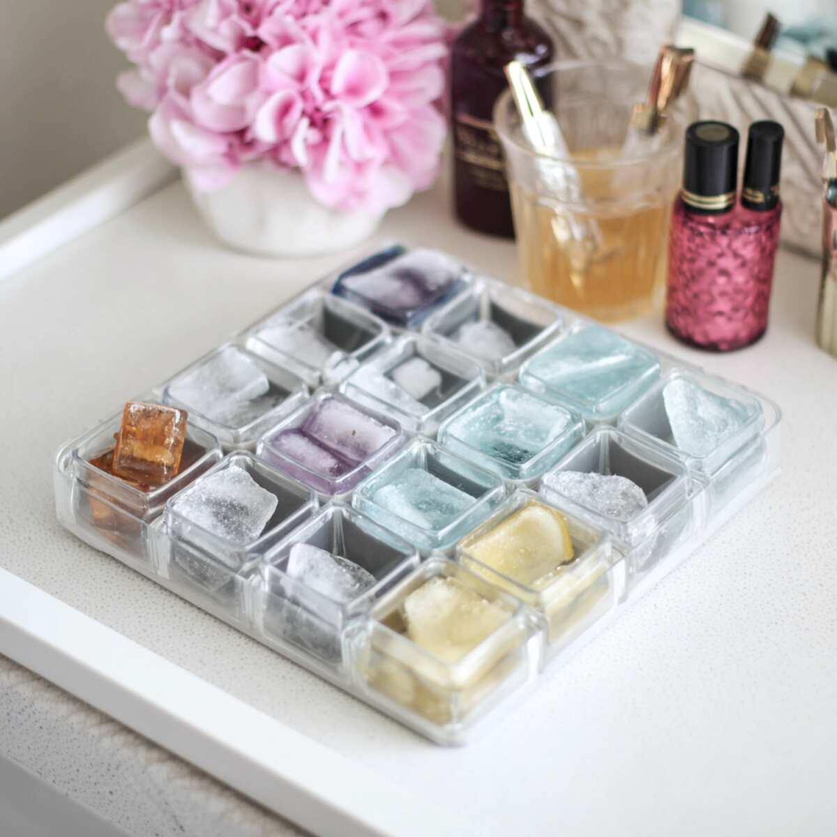 Ice cube trays make surprisingly useful organizers for small vanity items like lip balms, rings, or travel-sized products.