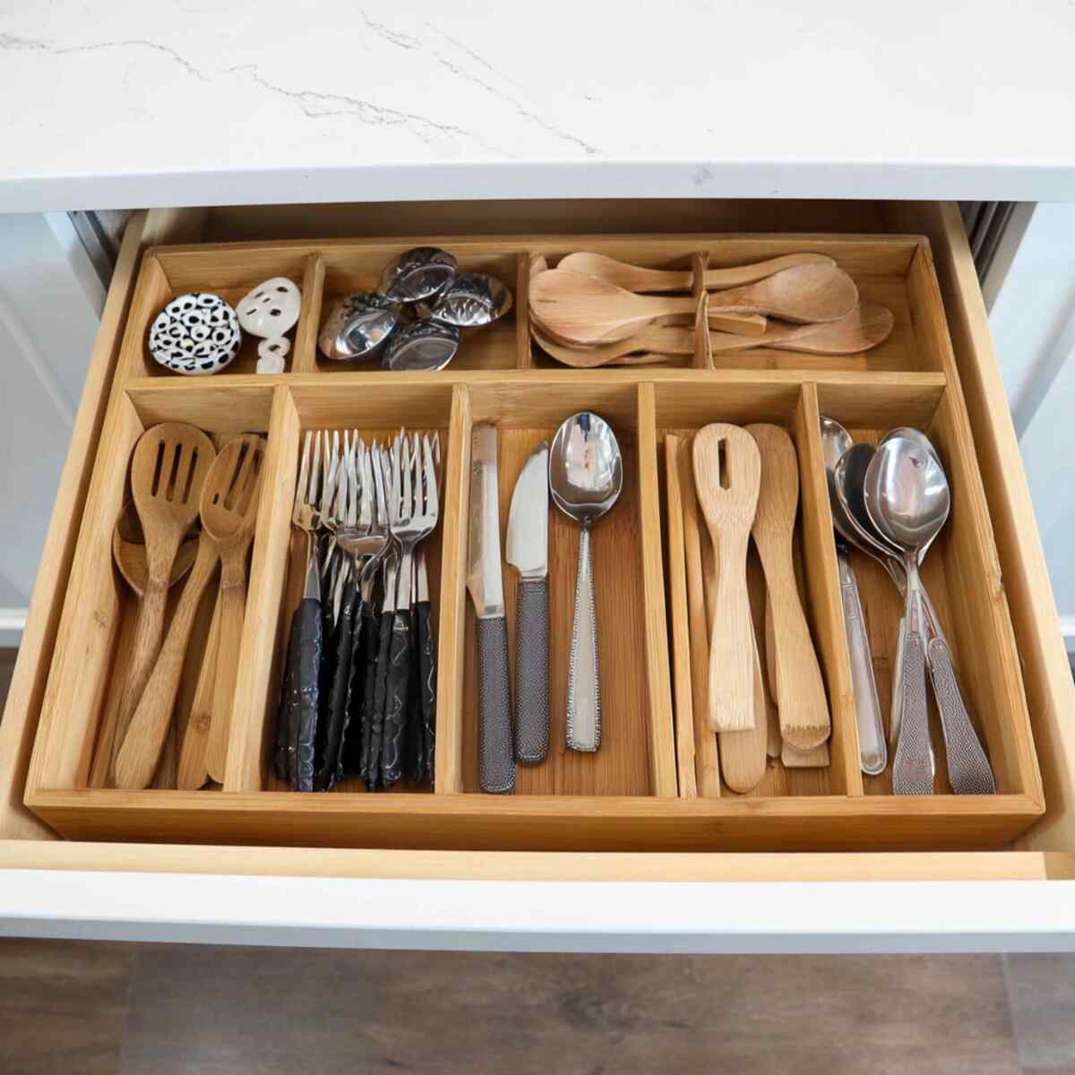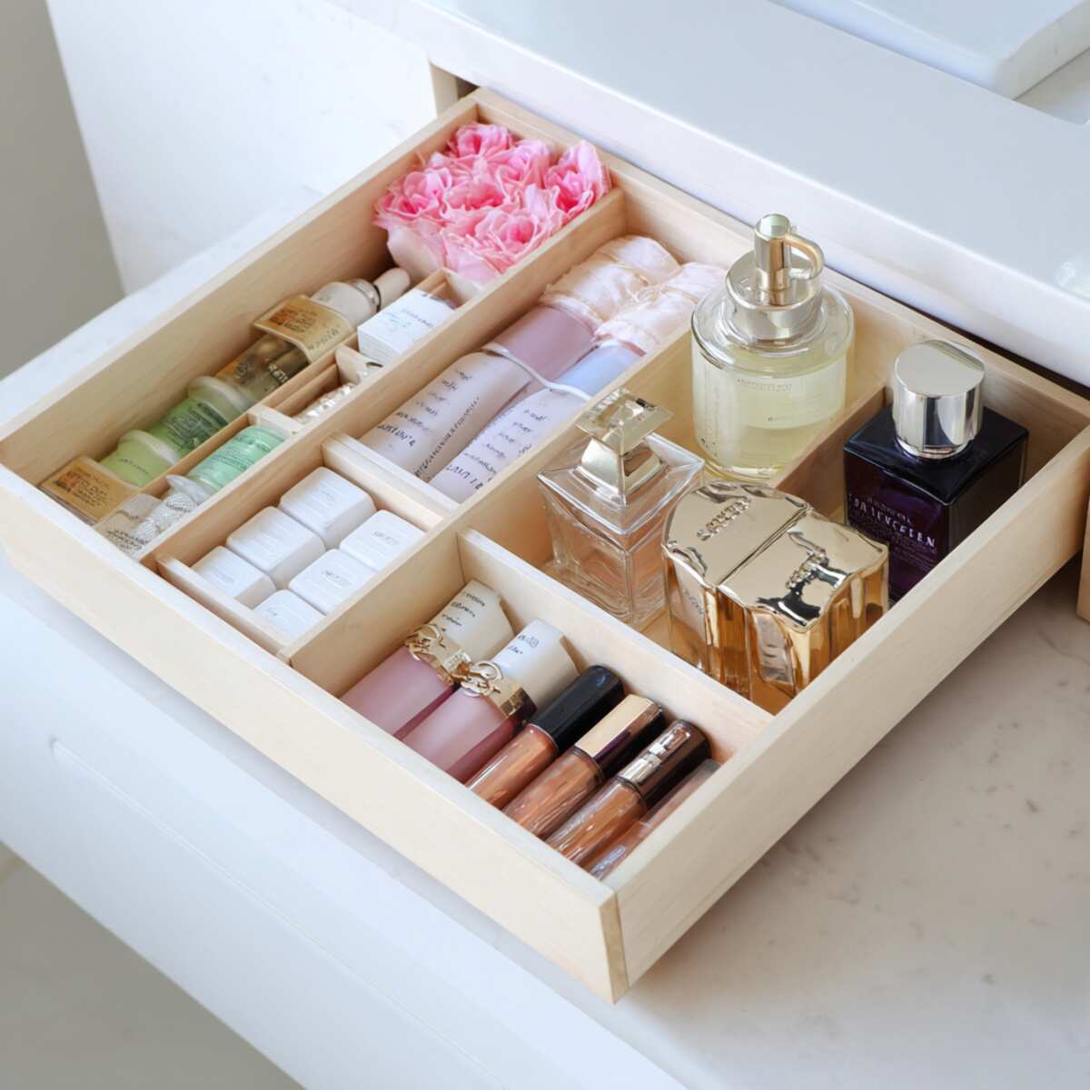 Bamboo utensil trays, originally made for kitchen drawers, make excellent vanity organizers due to their durability and natural beauty. They’re eco-friendly and give a sophisticated touch to your drawer setup.