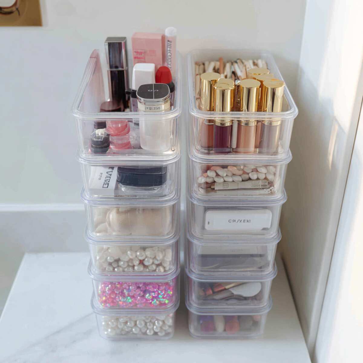 Stackable plastic bins help you maximize space, especially if you have deep vanity drawers. You can label each bin for different categories like skincare, hair tools, or nail products.