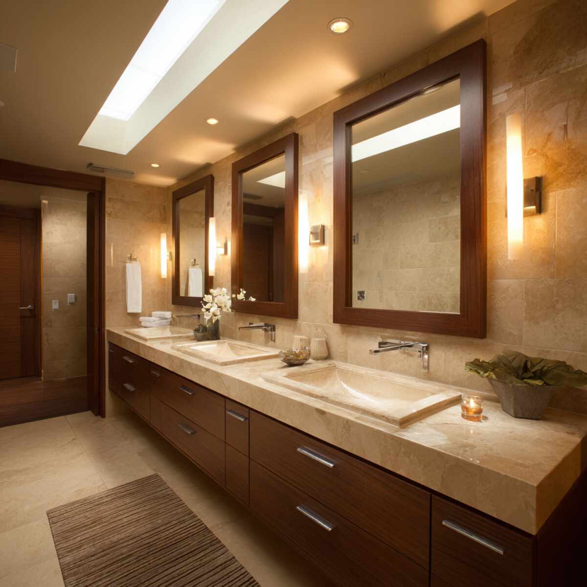 The soft, diffused light highlights your face evenly and adds depth to the wall behind the mirrors. This Double Vanity Lighting Idea is ideal for anyone wanting a modern, minimalist design with both style and function.