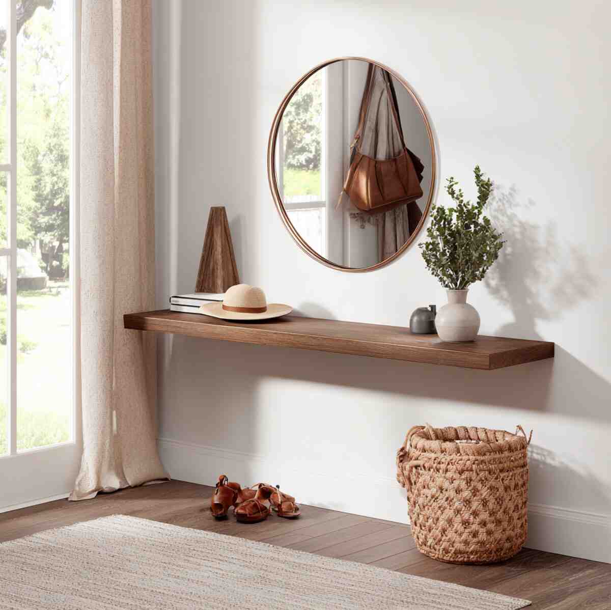 A minimalist wooden floating bench brings clean lines and a clutter-free look to your entryway. Its simple design makes the space feel open and welcoming while still providing a practical seating area.