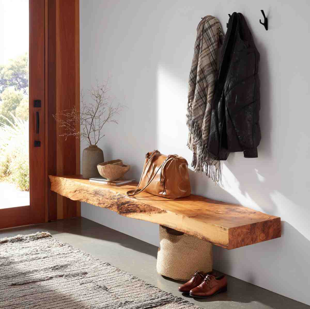 A live-edge wood floating bench adds natural beauty and warmth to your entryway. The organic edges highlight the wood’s raw texture, giving your home a cozy, rustic touch.