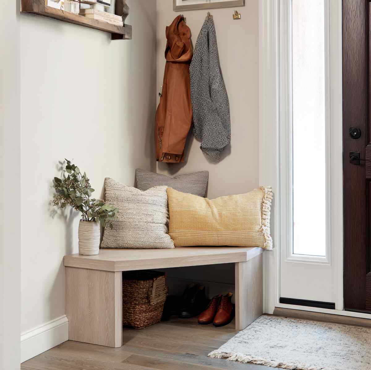 A corner floating bench makes smart use of small or awkward entryway spaces. It fits neatly into unused corners, creating seating without crowding the area.