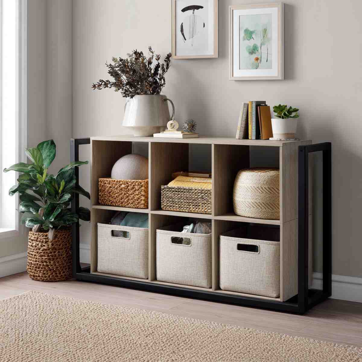 A metal frame cube rack brings an industrial touch to modern homes. It’s durable and open, making it easy to see and access stored items like shoes or backpacks.