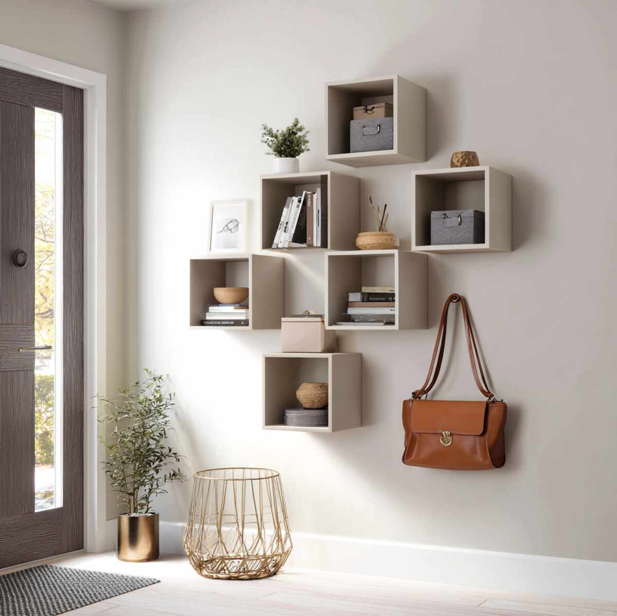 Wall-mounted cube shelves are great for small entryways where floor space is limited. You can use the cubes to display decor items or store daily essentials like keys and sunglasses.