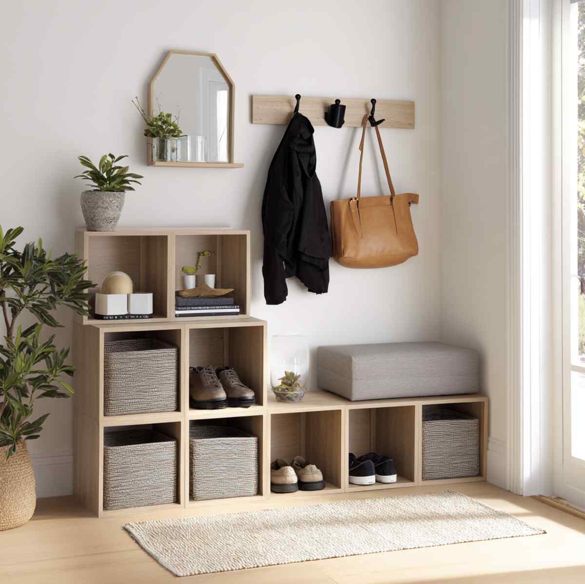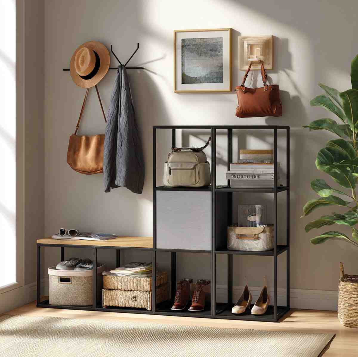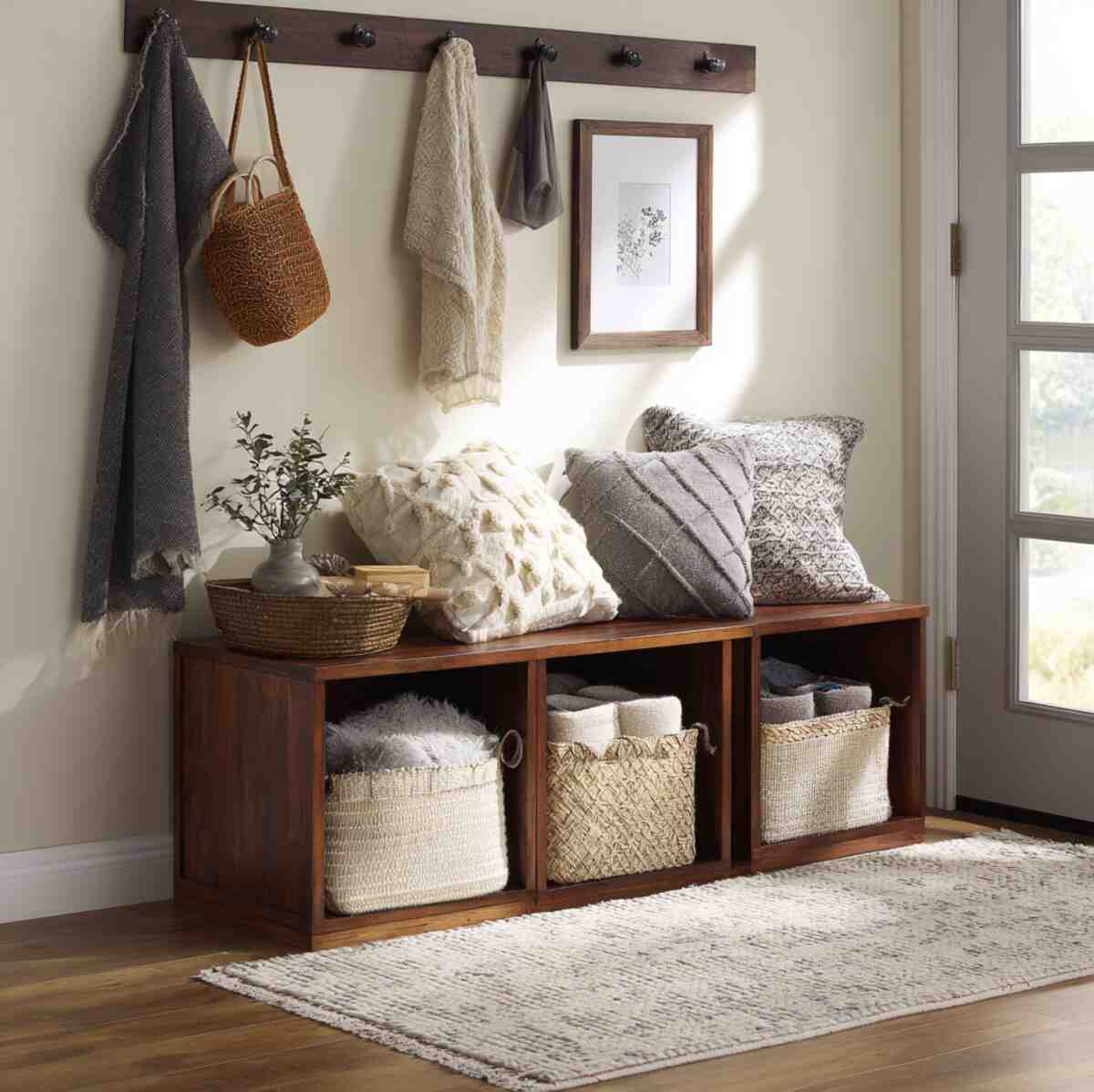 An entryway bench with built-in storage cubes adds both comfort and convenience. It allows you to sit while putting on or taking off shoes, and the cubes beneath can hold shoes, scarves, or bags.
