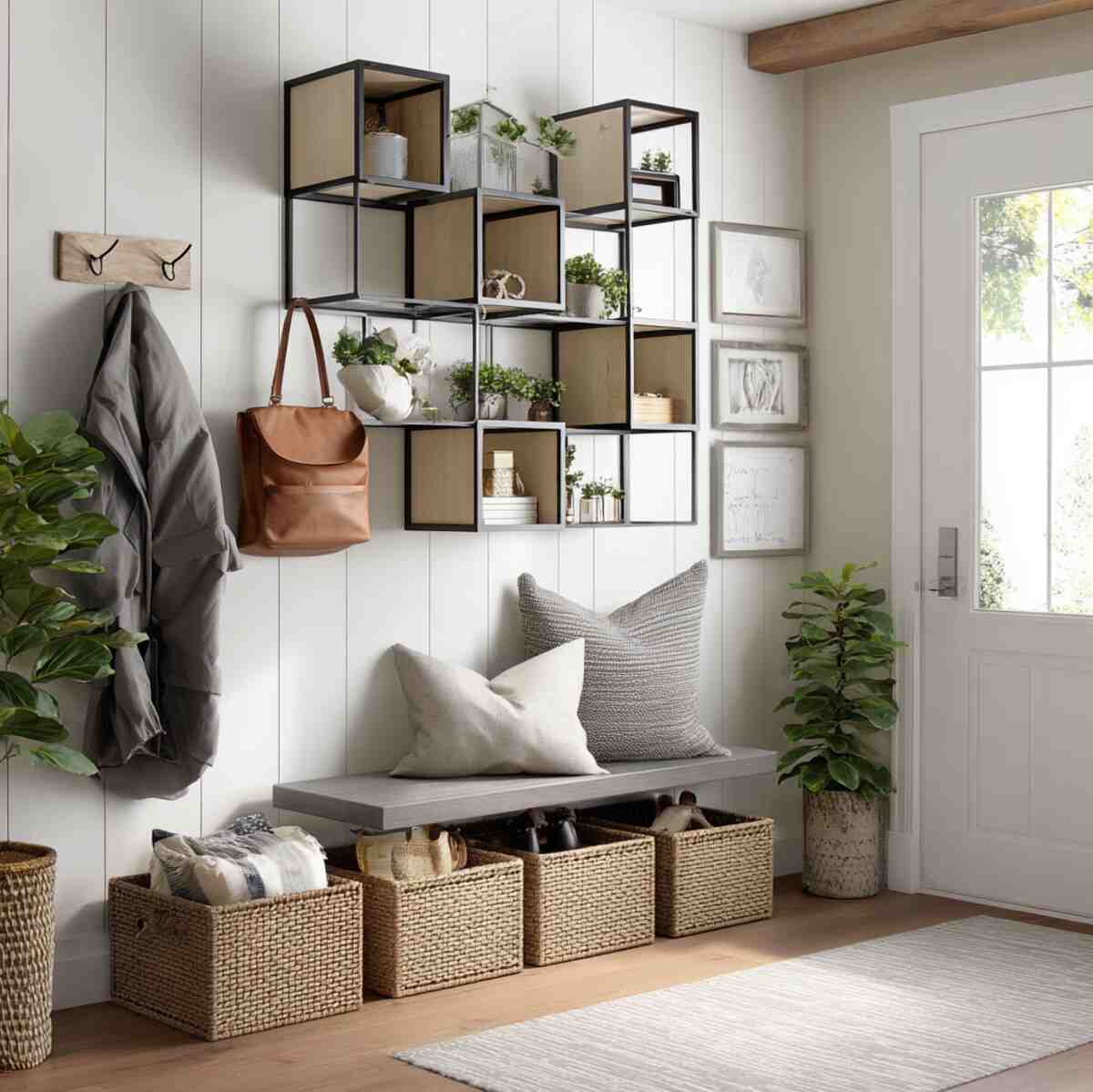 This Entryway Storage Cube Idea is perfect for those who want a clean, modern look with plenty of hidden storage.
