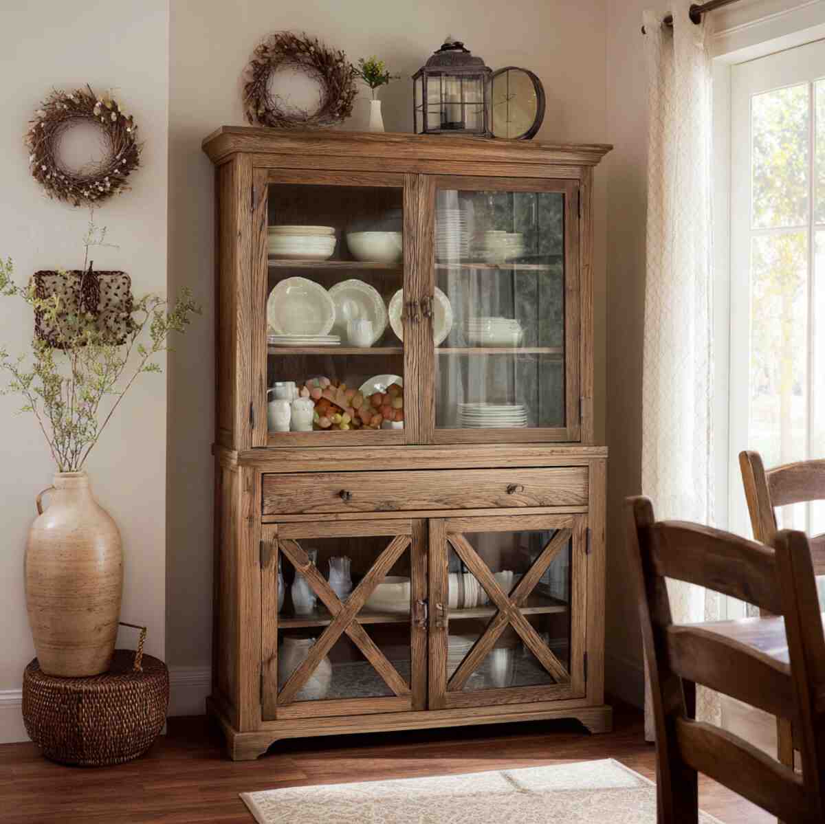 A rustic wood and glass door hutch captures the true essence of farmhouse living with its warm, natural tones and timeless charm.