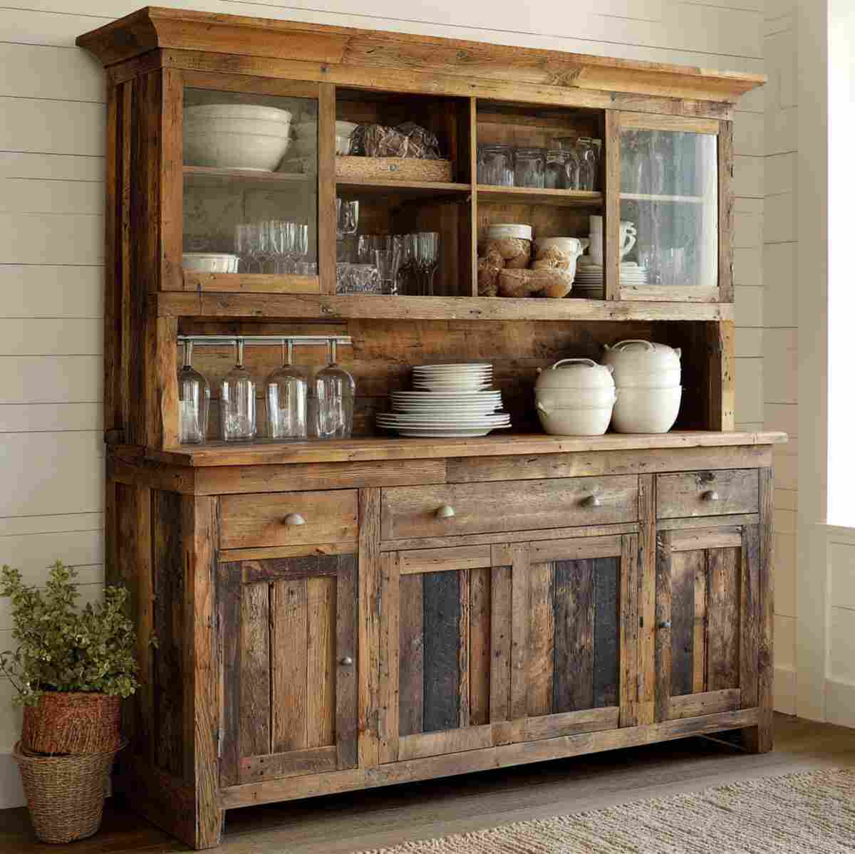 Made from repurposed materials, it carries a unique texture and natural imperfections that make each piece one of a kind. This is a meaningful choice among Farmhouse Dining Hutch Ideas because it promotes sustainability while preserving the raw, rustic charm of farmhouse décor.