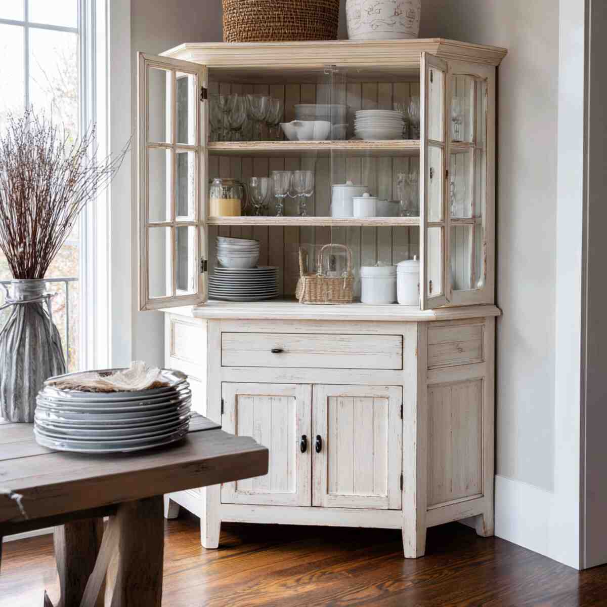 The glass doors let you proudly display your favorite dishes, vintage cups, or family heirlooms while keeping them safe from dust. This piece is an important addition among Farmhouse Dining Hutch Ideas because it blends beauty and practicality, making your dining area feel inviting and full of character.