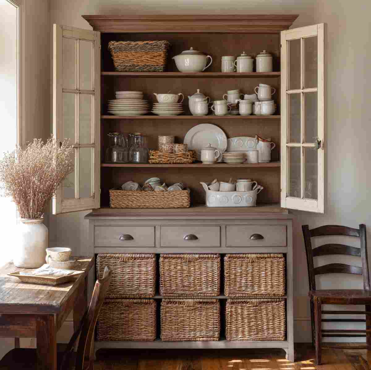 A farmhouse hutch with wicker baskets adds a layer of warmth and texture to your dining area. The combination of wood and woven baskets keeps the look soft and rustic while providing handy storage for napkins, cutlery, or linens.