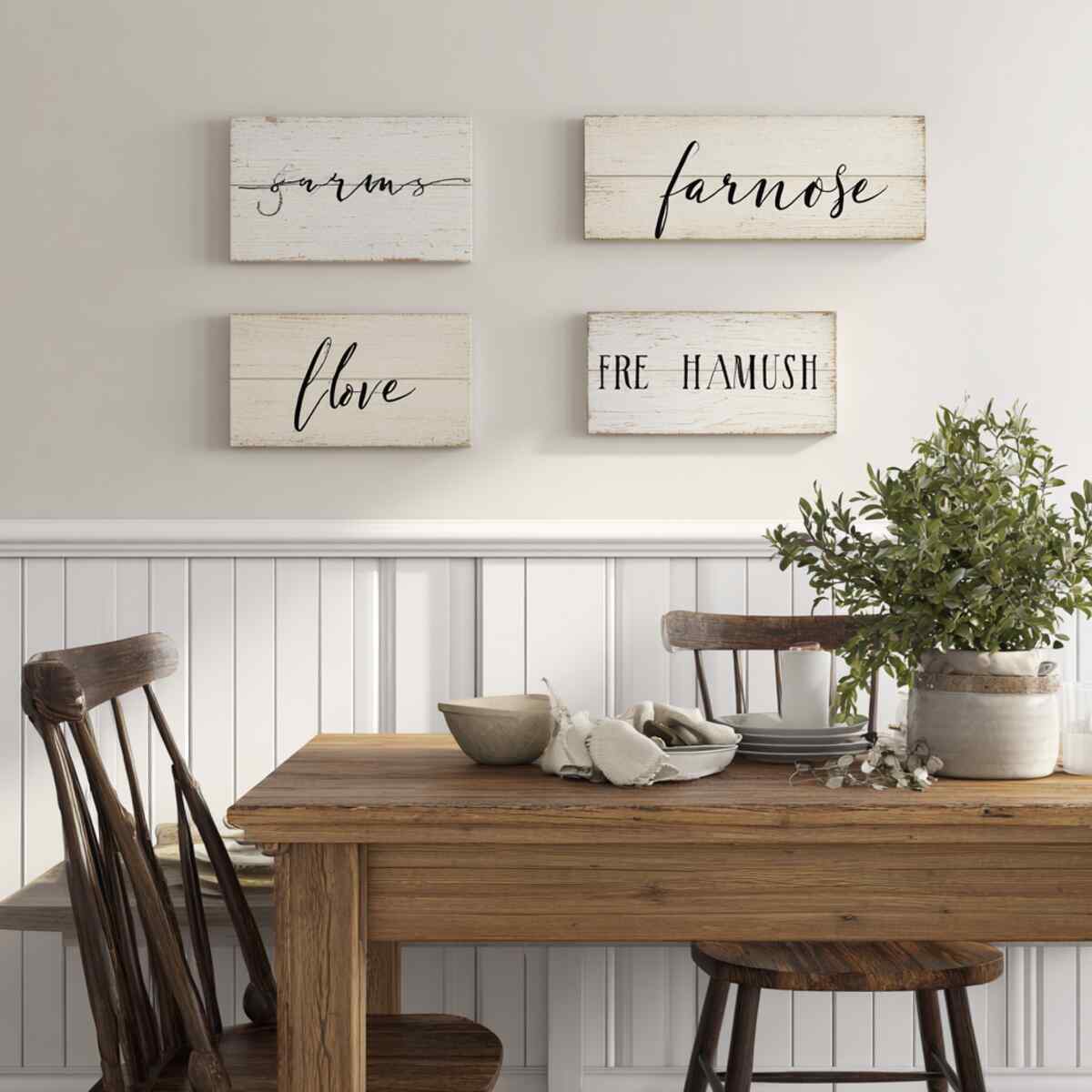 Vintage wooden signs are one of the most popular Farmhouse Dining Room Wall Art Ideas because they instantly add warmth and character to the space.