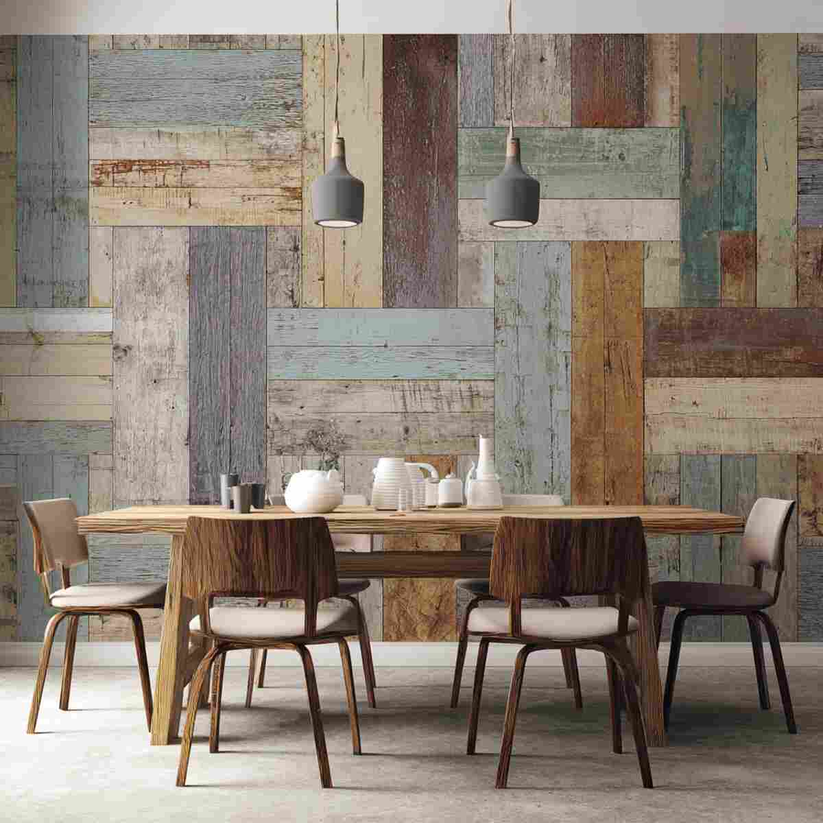 Distressed wood panels are bold Farmhouse Dining Room Wall Art Ideas that bring texture directly onto the walls.