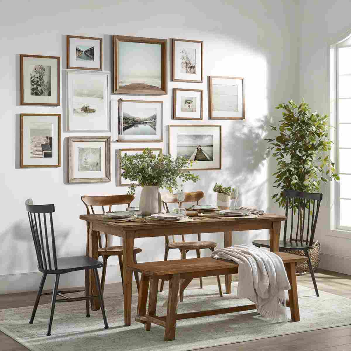 A gallery wall with mixed wood frames is one of the most flexible Farmhouse Dining Room Wall Art Ideas. It allows you to blend photos, prints, and textures while keeping a unified farmhouse look.