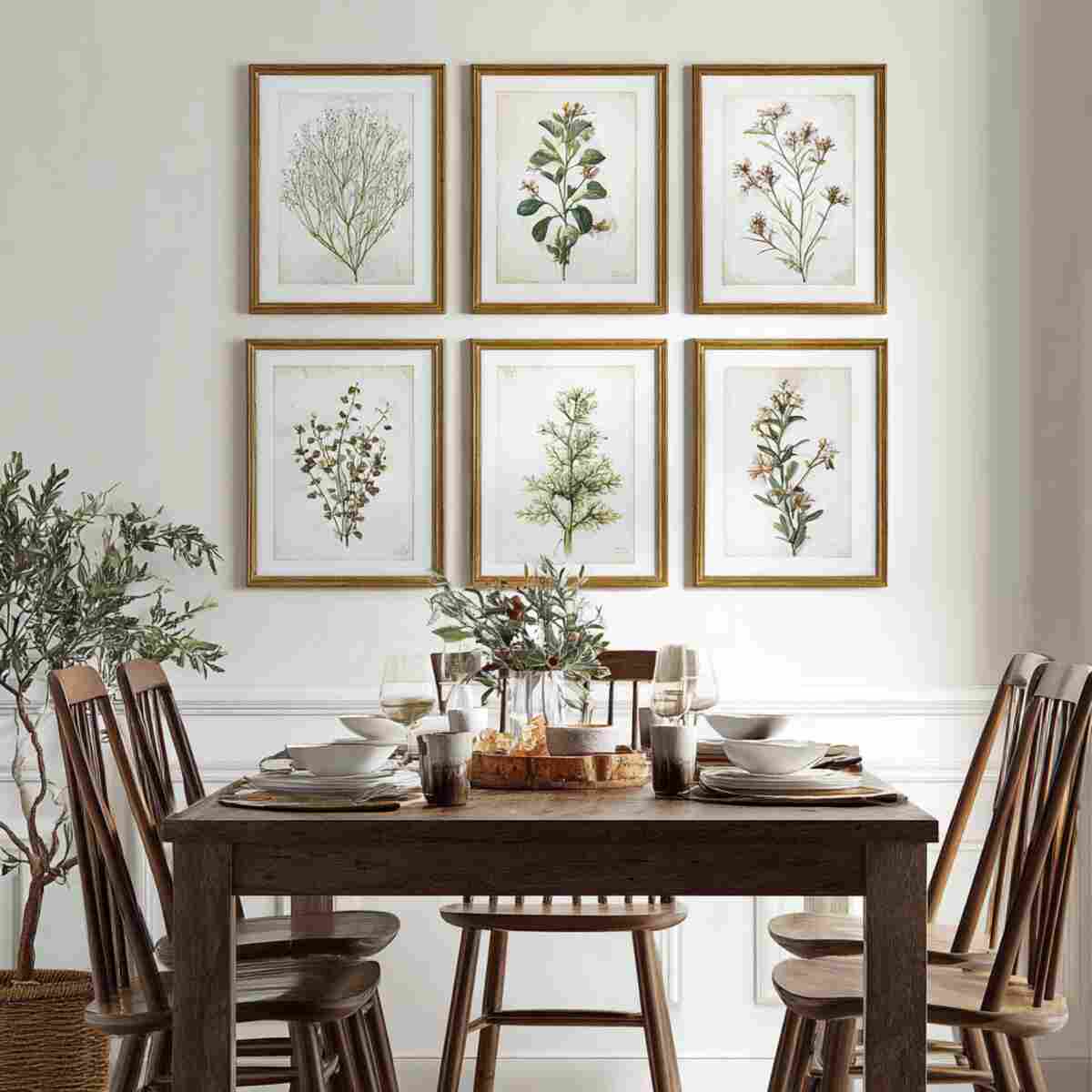 Framed botanical or herb prints are timeless Farmhouse Dining Room Wall Art Ideas that bring a soft, natural feel to the dining area.