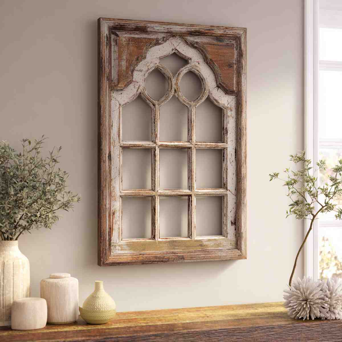 Antique window frames are creative Farmhouse Dining Room Wall Art Ideas that add depth and visual interest.