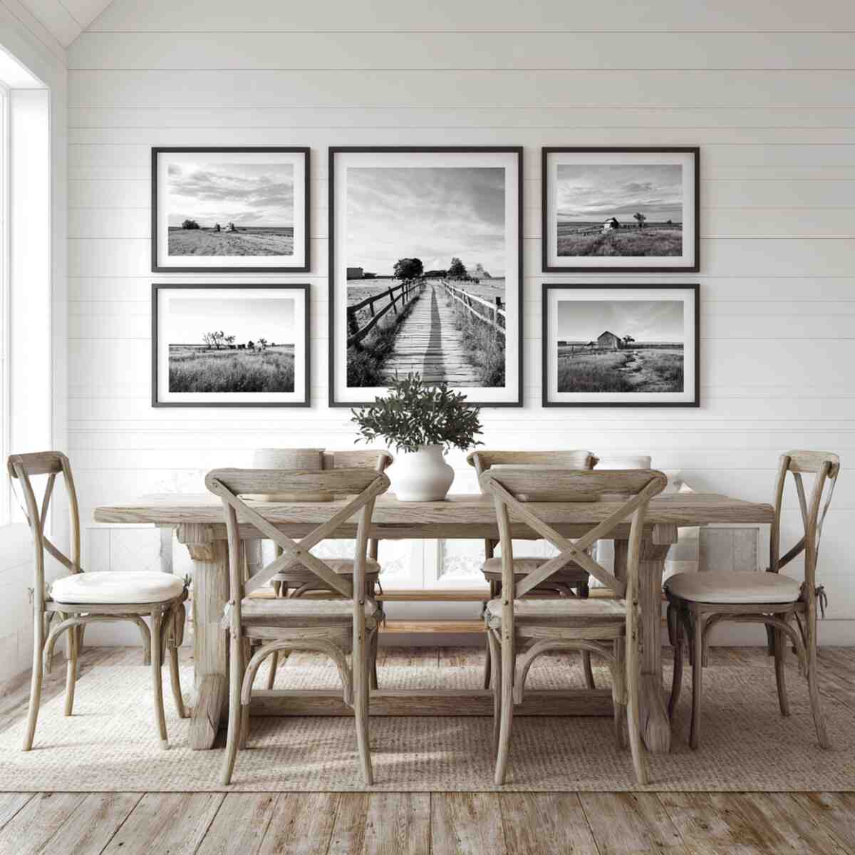 Black-and-white photography is a classic choice for Farmhouse Dining Room Wall Art Ideas because it keeps the look clean and timeless. Images of barns, fields, or rural life reinforce the farmhouse story without adding visual clutter.