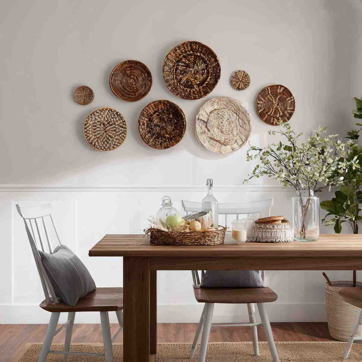 Woven baskets are unique Farmhouse Dining Room Wall Art Ideas that introduce texture and warmth.