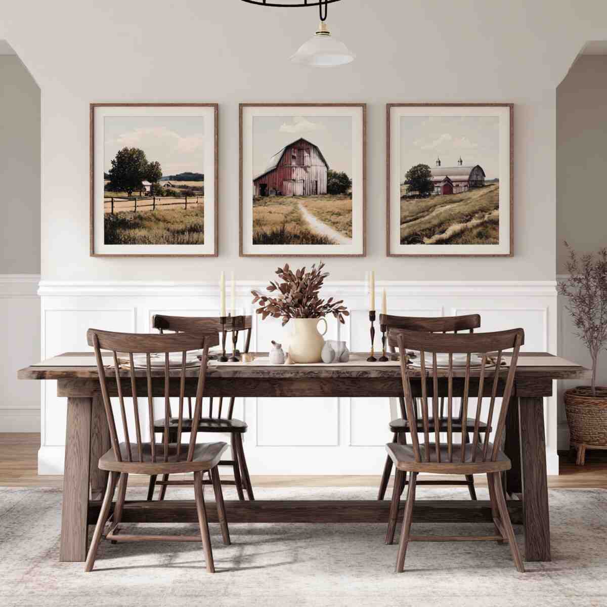 Barn-inspired landscape prints are meaningful Farmhouse Dining Room Wall Art Ideas because they directly reference rural living.