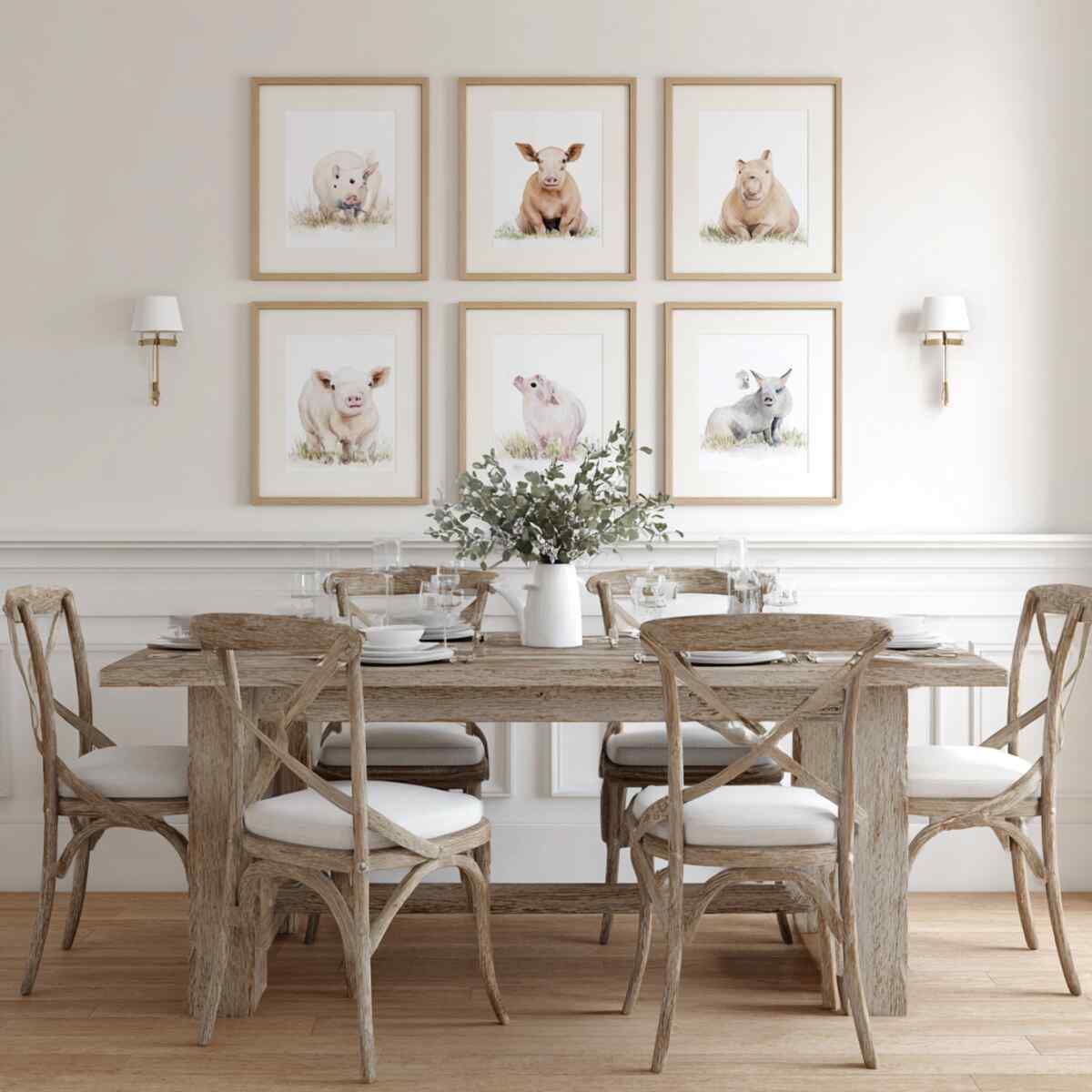 Farm animal illustrations are charming Farmhouse Dining Room Wall Art Ideas that add personality without feeling childish.