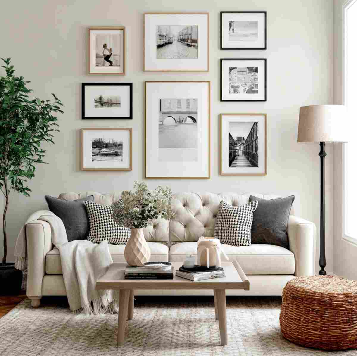 Placing one large piece in the center and surrounding it with smaller frames creates a strong focal point.