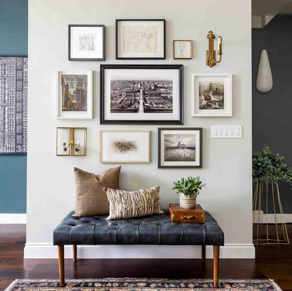 A salon-style arrangement fills the wall with frames of different sizes, shapes, and orientations.