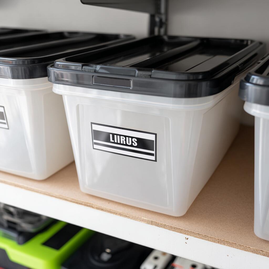 Clear bin labels with bold text are one of the most practical Garage Labeling and Organization Ideas because they let you see and read contents at a glance.
