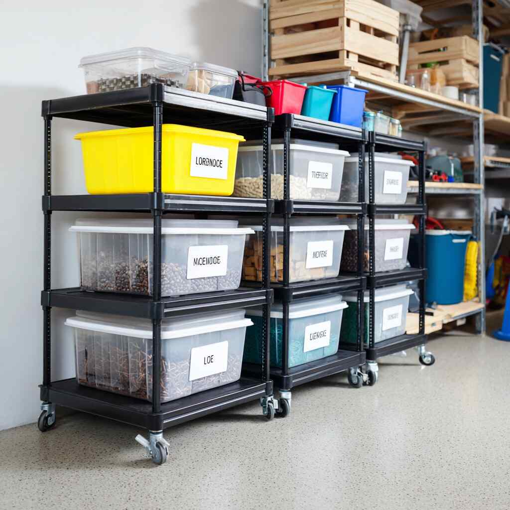 Labelled rolling storage carts are mobile Garage Labeling and Organization Ideas that combine flexibility and order.