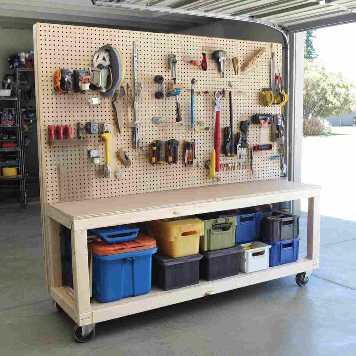 Combining a pegboard with a workbench is one of the most practical Garage Tool Pegboard Design Ideas for hands-on users.