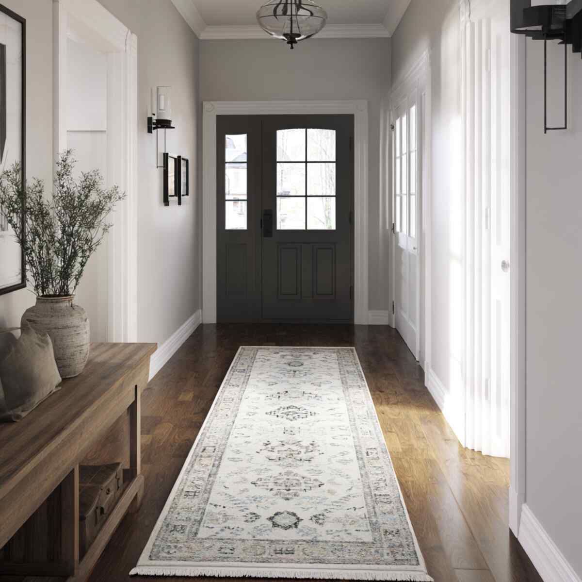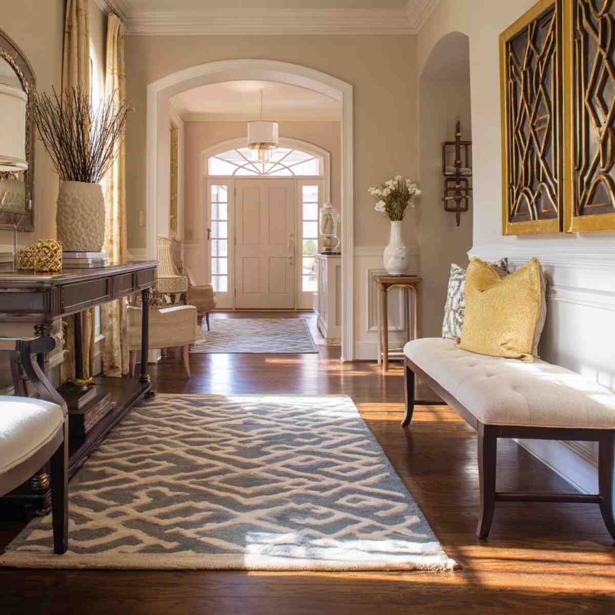 This layout matters in Hallway Accent Rug Layout Ideas because it keeps the hallway feeling open and elegant rather than crowded.