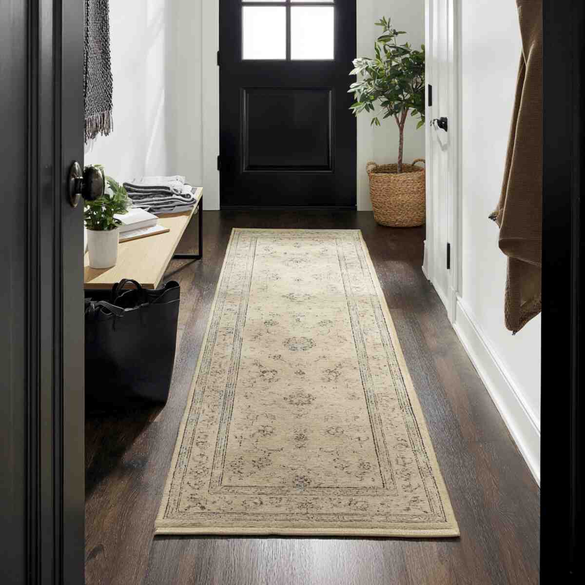 It helps define the hallway as a separate visual zone while still keeping the space soft and comfortable underfoot.