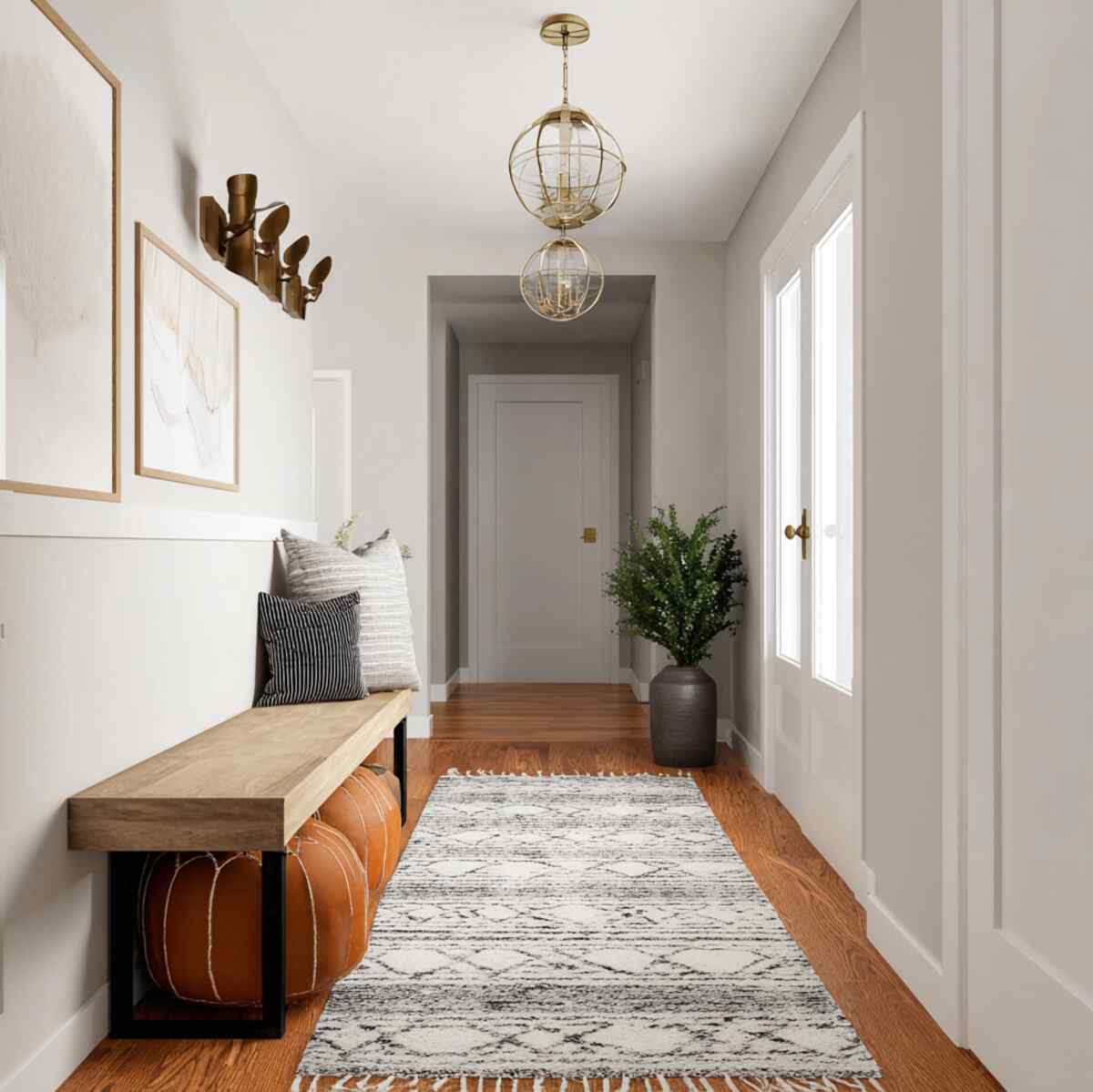 This layout works well in wider hallways or those with built-in storage on one side.