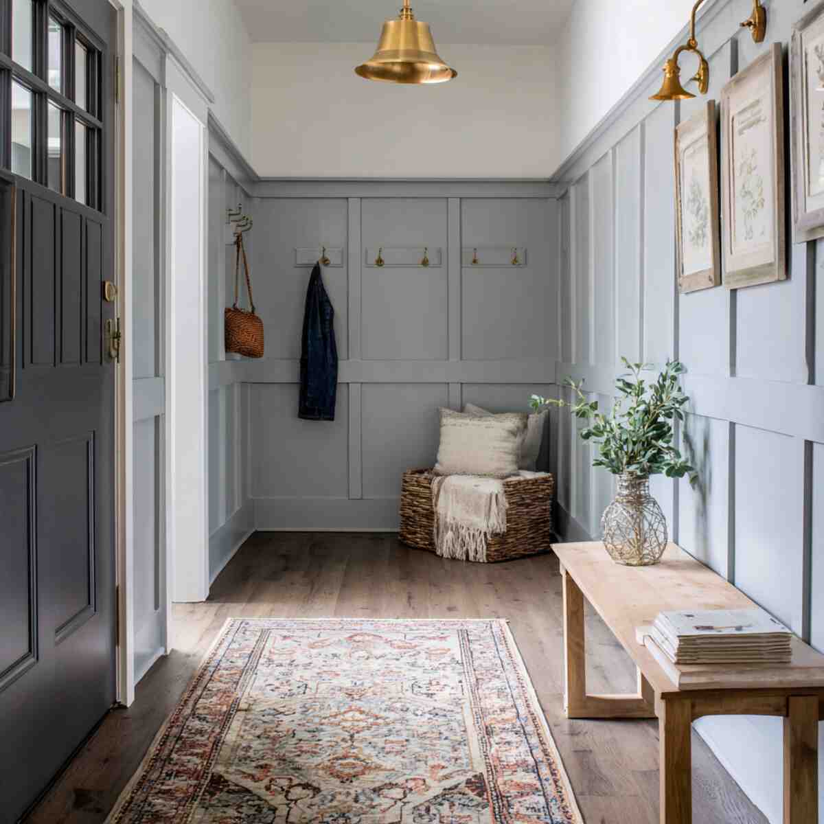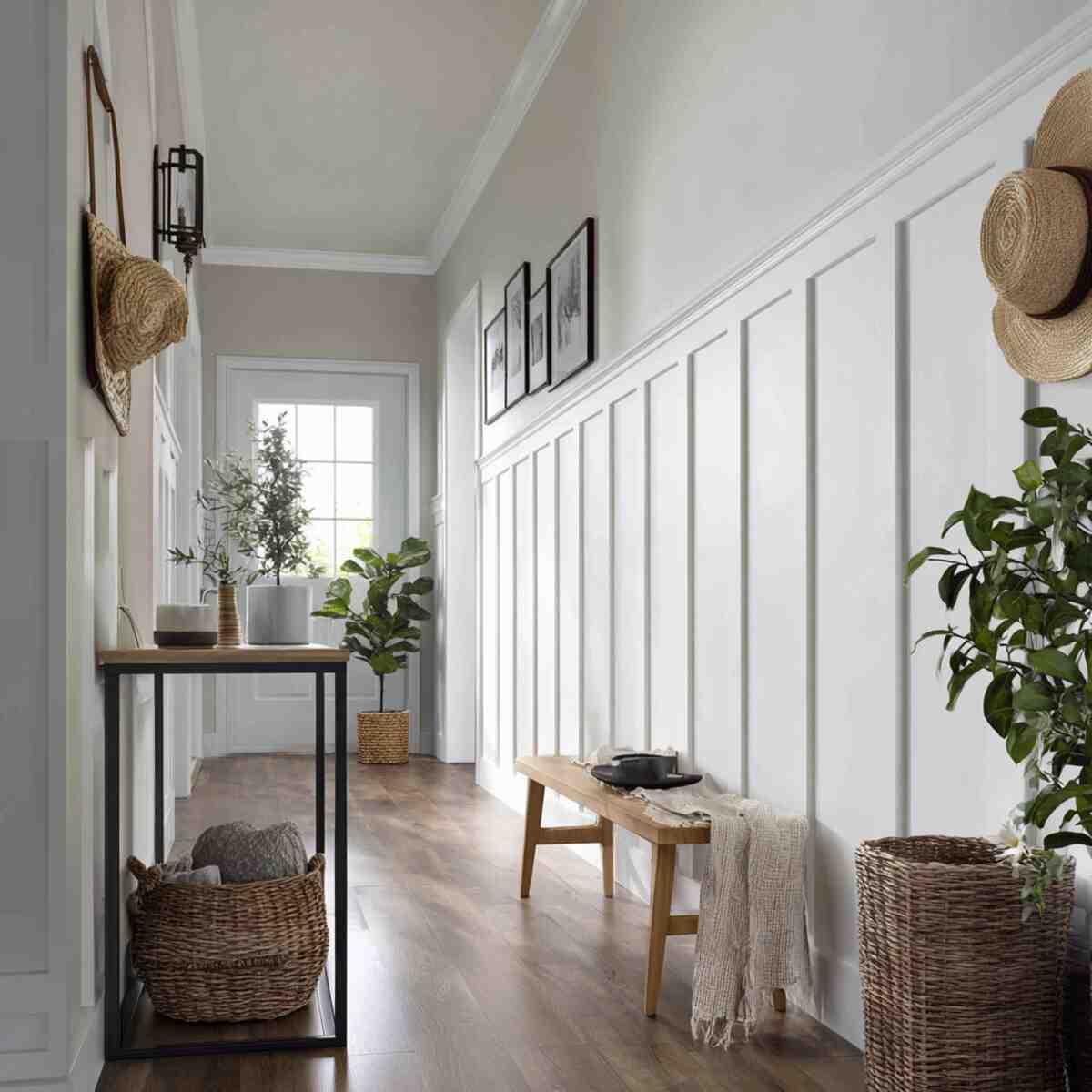 Soft gray board and batten walls provide a subtle, elegant backdrop in your hallway.