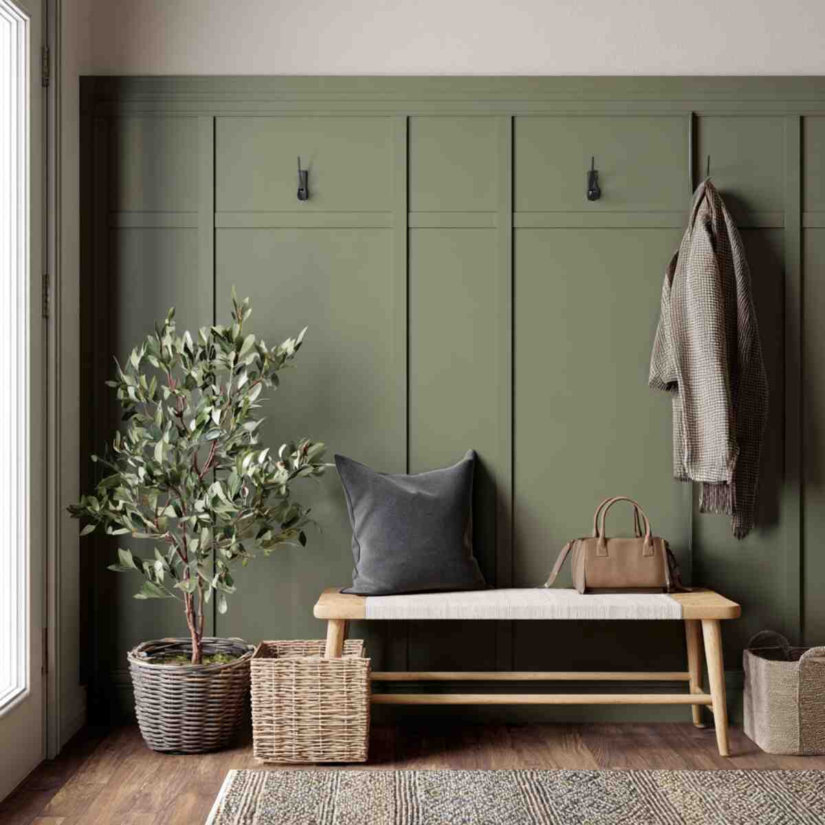 An olive green board and batten wall brings earthy tones and a sense of calm to your hallway.