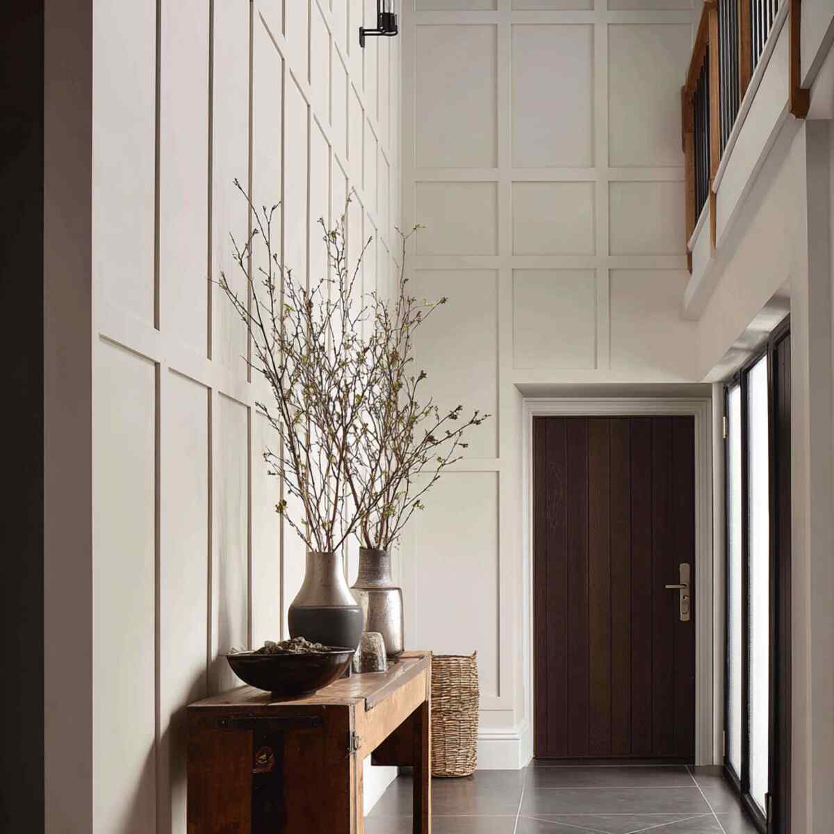 Full-height board and batten walls create a sleek and modern hallway design. Vertical battens draw the eye upward, making the space feel taller and more spacious.